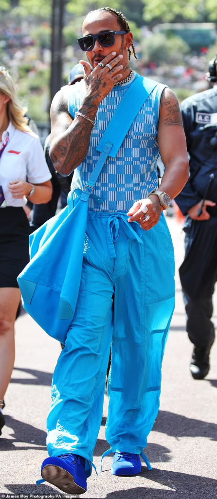 Lewis Hamilton is known for his bold and flashy lifestyle. And his fashion frenzy attires have led to questionable situations on several occasions. On Saturday, Lewis Hamilton stepped into the Monte Carlo Circuit wearing a vibrant aquamarine ensemble with a lot of jewelry amid his tussle with the FIA over the jewelry ban. The seven-time world champ wore a blue checkered vest top with wide teal trousers and a pair of azure sneakers. The Briton also has a blue sling bag on his shoulder for his essentials. The sleeveless vest displayed his intricate arms tattoos, making him look like a high-profile male model.