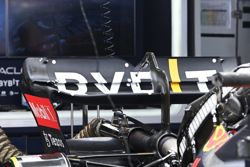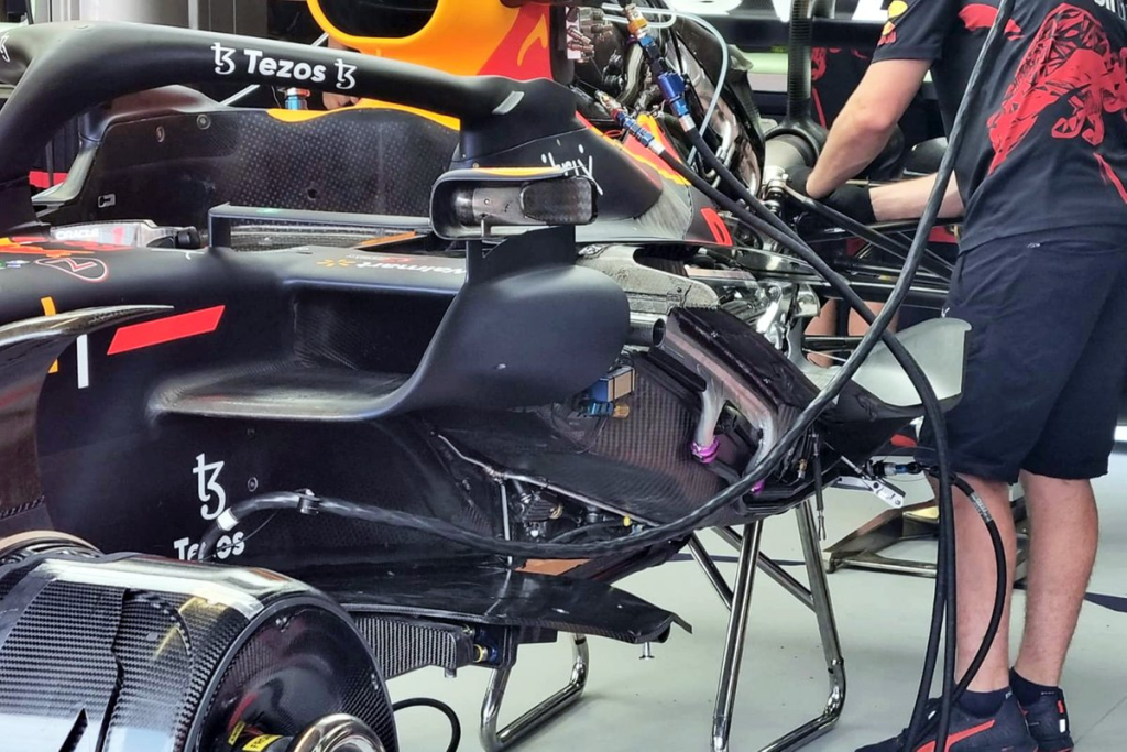 The Red Bull has fitted a high downforce rear wing to the RB18. They plan on using the rear-facing camera to understand the amount of flexion they are getting. The team will also use chequered stickers on the outer transition section of the endplate in order to study the movement.