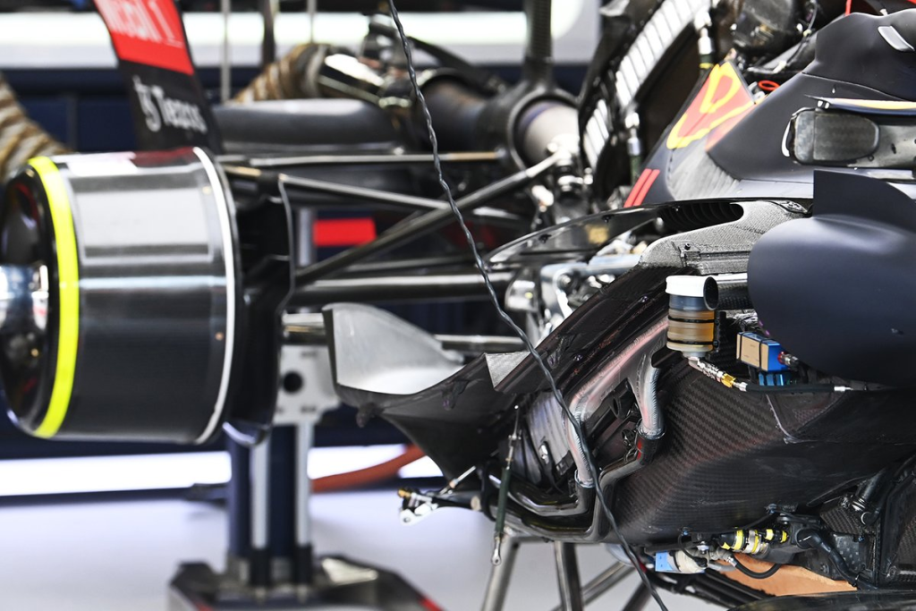 Another shot of the RB18 without external sidepod bodywork revealed that the team had used some additional bodywork attached to the heat exchangers to assist the flow through the assembly. In addition, the diffuser look-alike strakes coincide with the external louvres to channel the rejected heat.
