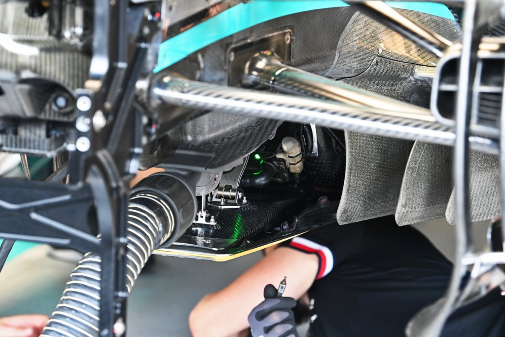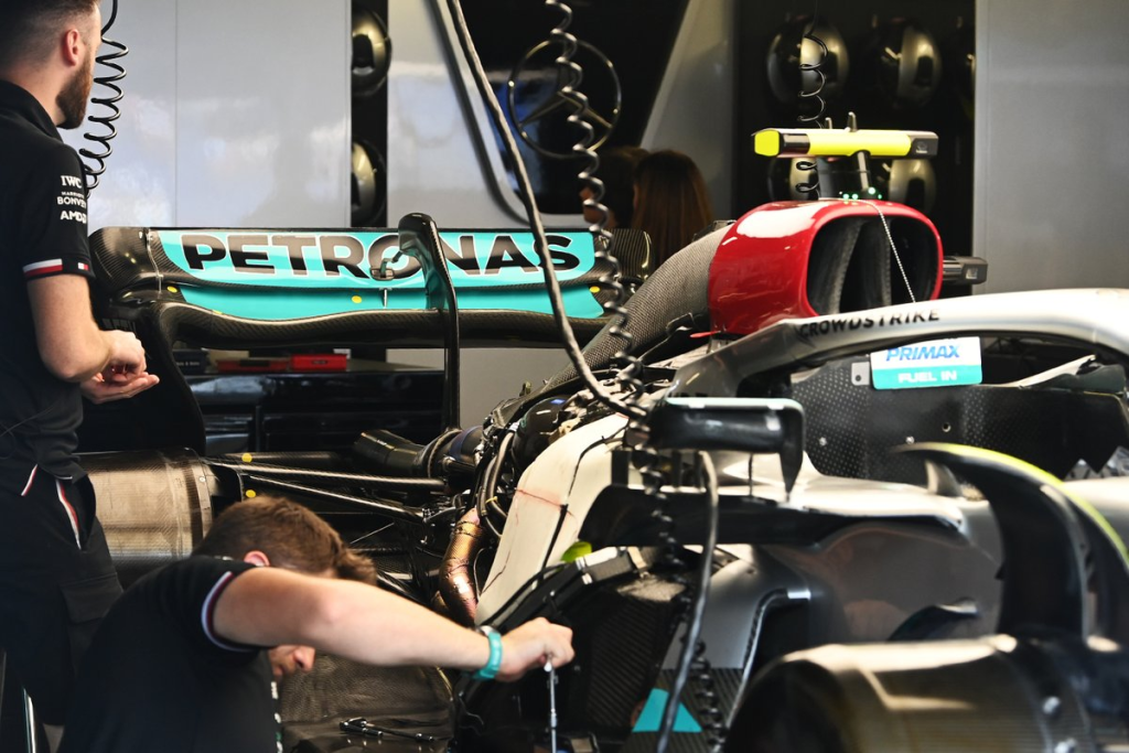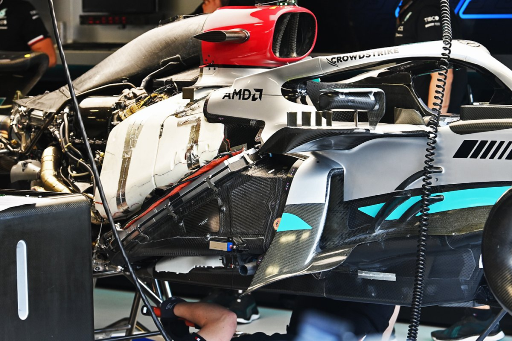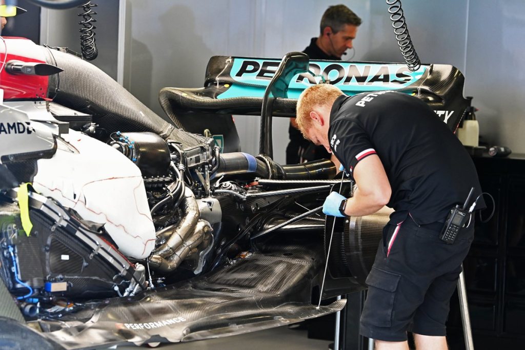 Furthermore, a Mercedes mechanic was seen installing a metal floor stay and attaching it to the gearbox casing. Also, a vast quantity of detailing has been done in the radiator casing, power unit installation, floor contouring, gearbox casing, and inboard rear suspension.