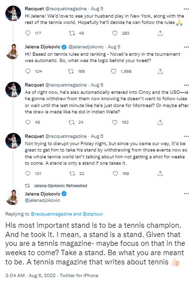 Jelena quickly shot back by questioning the logic behind the magazine\’s sweet. She revealed that Djokovic\’s entry into the Canadian Open was automatic based on tennis rules and rankings. The shots continued to get fired from both sides, with Jelena advising Raquet Magazine to focus on being a tennis magazine and take a stand. She added, \”Be what you are meant to be. A tennis magazine that writes about tennis.\”
