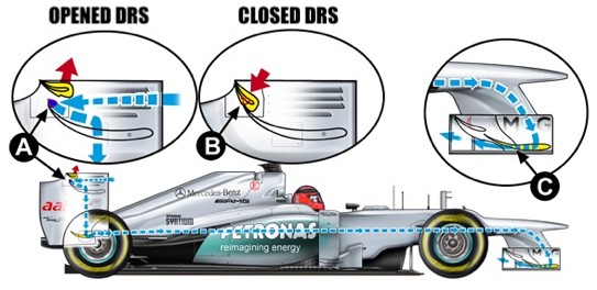 The distance between the two cars is measured at a detection point before the DRS zone using electronic timing loops on the track surface. A signal activates the car\’s DRS in the ensured zone if the following car is found within a second of the leading car. A dash light on the driver\’s steering wheel activates to inform them about the DRS availability. The attacking driver can activate the DRS manually by pressing a button on their steering.